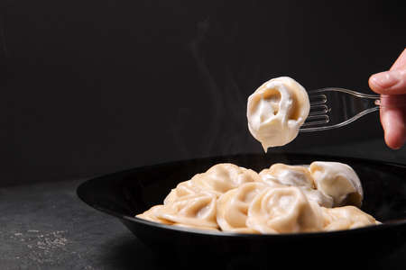 lot of boiled dumplings with sour cream on a black plate on a dark background side view, 1 dumpling on a fork