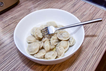 plate with homemade Russian dumplings on a wooden table and a fork in the plate.