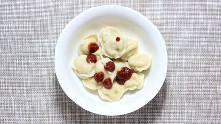 Boiled meat dumplings in a bowl with ketchup. Top view.