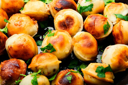 Frying pan with roasted tasty pelmeni.Fried dumplings