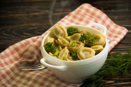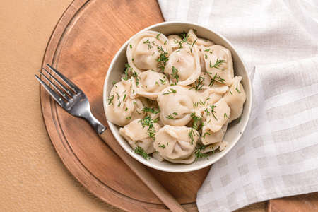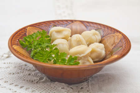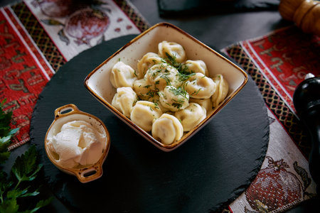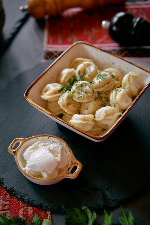 Russian cuisine. Dumplings in a ceramic bowl with sour cream and herbs.