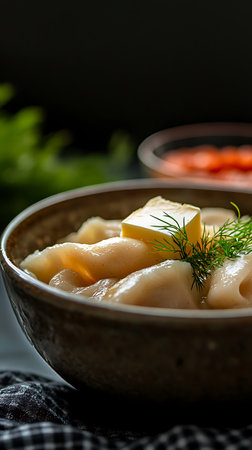 Close-up of traditional pierogi in a rustic bowl, adorned with a cube of melting butter and fresh dill. A side of tomato sauce completes the culinary experience.