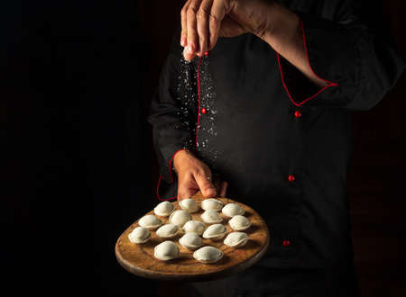 An experienced chef salts meat dumplings on a cutting board. Concept for a hotel menu on a black background with space for advertising