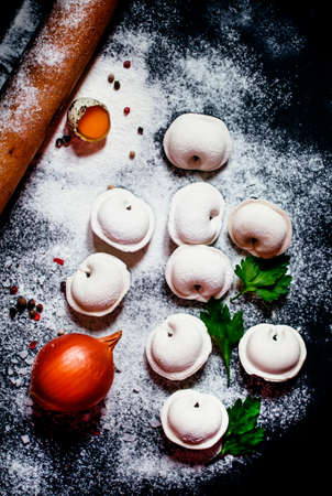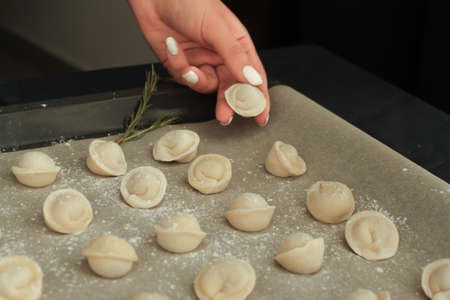Russian raw dumplings. manual production. Traditional Russian food. Close-up.
