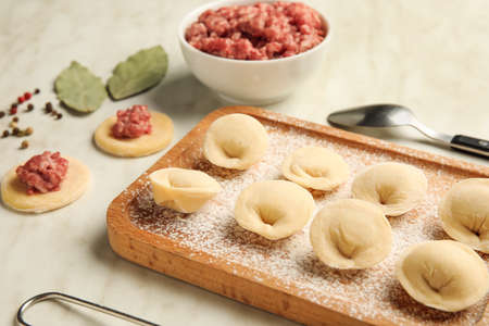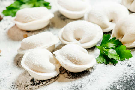Raw homemade Russian dumplings with meat close-up. Traditional cuisine. Selective shot.