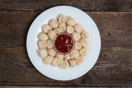 boiled dumplings with ketchup in a plate on a wooden table