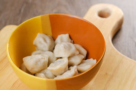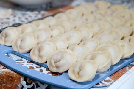 plate of homemade dumplings, and not boiled standing on the board. selective focus .