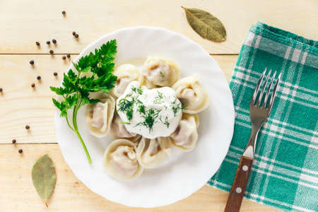 Homemade Meat Dumplings served with sour cream and fresh parsley on plate.Traditional russian food- pelmeni, ravioli