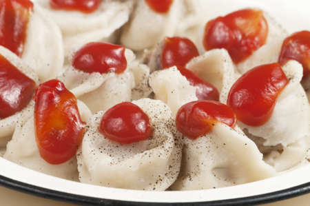 meat dumplings (pelmeni) with pepper and ketchup, close-up