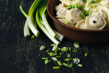 Boiled dumplings with feathers of green onions. In the background are greens, red peppers and bay leaves. On a black wooden background. Copy space.