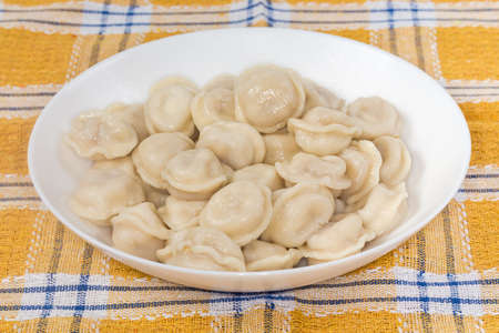 Small boiled dumplings round shape with meat stuffing on a white dish on a checkered cloth tablecloth, close-up in selective focus