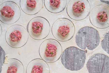background of homemade meat dumplings or ravioli with meat. Traditional Russian national pelmeni food. Dough from flour and circles maked with glass, close up