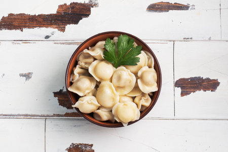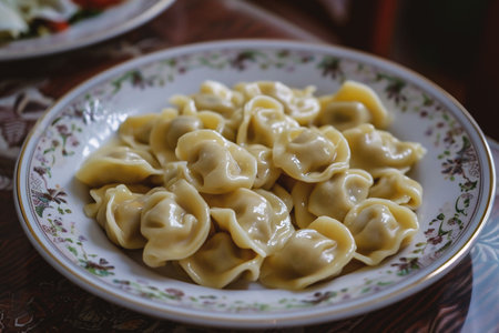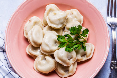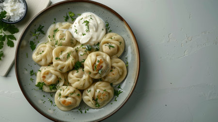 Delicious plate of pelmeni, russian dumplings filled with minced meat, topped with sour cream and parsley, served in a restaurant setting