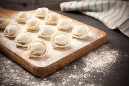 Closeup on semi-finished pelmeni dumplings on the wooden board.