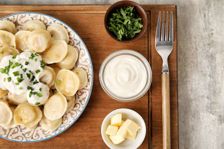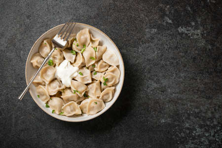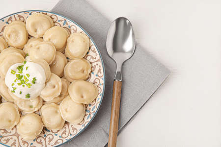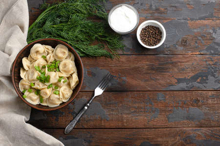 boiled dumplings with pepper, sour cream, with appliances on a wooden background top view, Russian national food