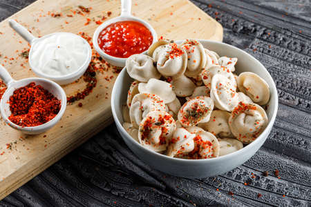 Meat dumplings russian pelmeni with pepper and sour cream in bowl