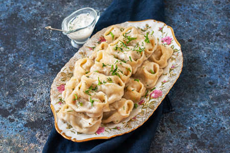 Oriental traditional food - Manty with minced beef or lamb meat in a plate with sauce on a blue background.