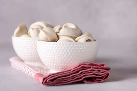 Homemade Raw Frozen Pelmeni and Vareniki in White Bowls Traditional Russian Handmade Dumplings Gray Background
