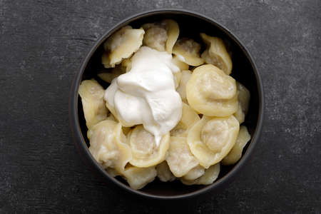 Boiled dumplings with meat in a pot, with sour cream. On a dark background
