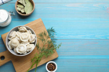 Delicious dumplings served on turquoise wooden table, flat lay. Space for text