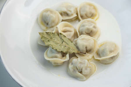 Restaurant serving dishes, close-up. Meat dumplings on a white plate with bay leaf.