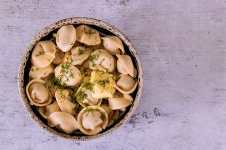 Boiled meat dumplings served with butter and dill. Top view.