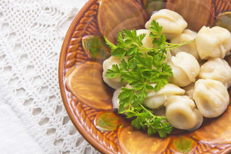 Dumplings decorated with greens, close-up in a brown plate on a white linen tablecloth
