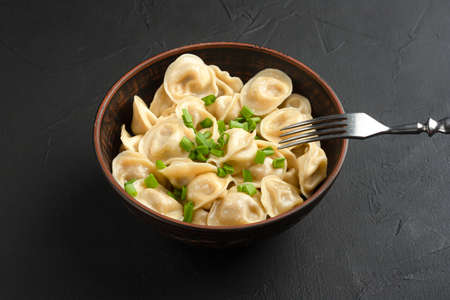 Traditional Russian pelmeni, ravioli, dumplings with meat on black background.