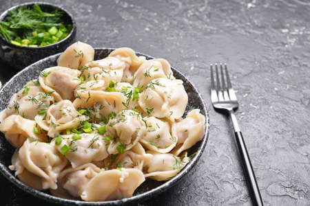 pelmeni with butter and greens on a black wooden table. Russian traditional dish of dough and minced meat. close up photo.