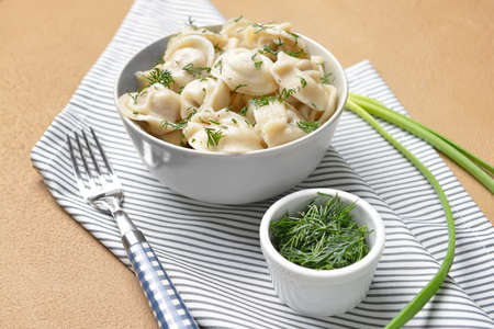 Bowl with tasty dumplings on color background