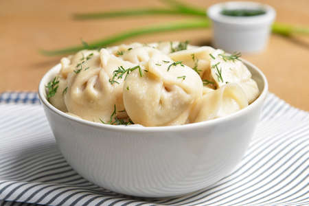 homemade tasty pelmeni with sour cream in restaurant
