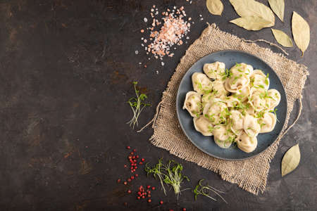 Dumplings with pepper, salt, herbs, microgreen on black concrete background and linen textile. Top view, flat lay, copy space.