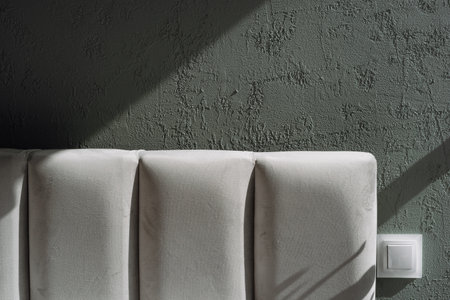 Soft upholstered headboard close to light switch, against textured wall on copy space backgrounds. Light source casting a shadow in morning bedroom interior