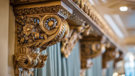 A detailed shot of the ornate stage curtain with golden tassels and intricate embroidery adding a touch of grandeur to the space