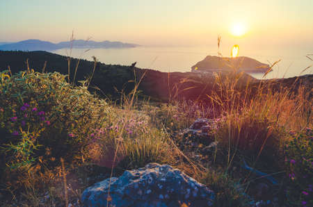 Beautiful view of the sunset and the natural landscape with the sea and hills or mountains in Montenegro.