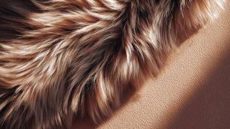A macro shot captures soft brown fur resting on a textured tan leather surface. The image conveys warmth luxury and comfort, suitable for fashion decor or product backgrounds. Generated A.I.