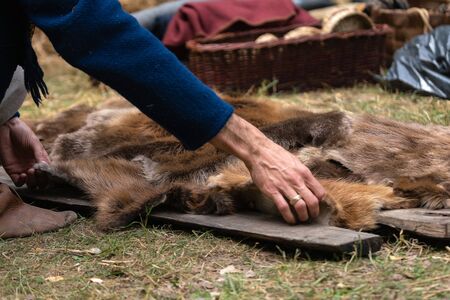 Man hands picking up wild animal fur of the ground. Animal coat skin for sale at rural village
