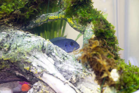 Nannacara. Blue aquarium fish on a background of algae. Cichlids.
