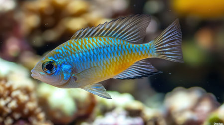 A stunning close-up of a vibrant freshwater fish gracefully swimming through an underwater environment filled with colorful corals and diverse aquatic life.