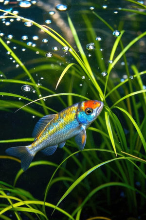 A vibrant fish gliding gracefully through lush aquatic plants in a serene underwater environment during daylight.