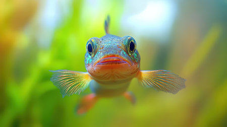 A cheerful fish with vibrant colors showcases its playful nature in a close-up view against a vivid backdrop.