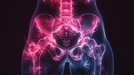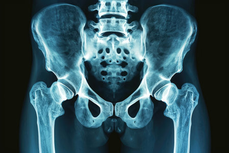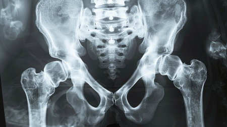 High-resolution X-ray image of a human pelvis and hip bones. Concept of medical imaging, skeletal anatomy, diagnostic tool, healthcare illustration.