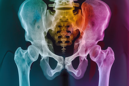 An x-ray image depicting the bones of a human skeleton, highlighted with vibrant colors, providing a detailed view of the skeletal structure, Color-coded 3D X-ray of the pelvic bone, AI Generated