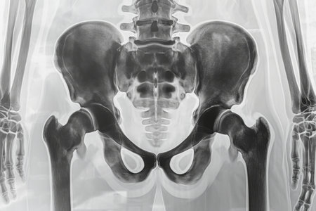 This X-ray reveals a detailed view of the human pelvis, highlighting the hip joints and surrounding bone structure in a clinical environment, showcasing alignment and health.