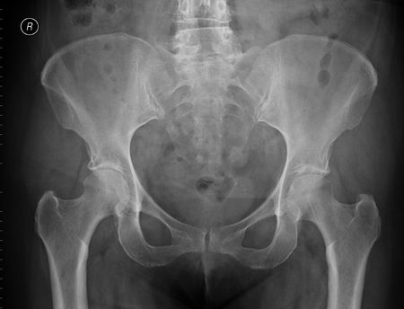 Detailed X-ray image showing human pelvis and hip bones