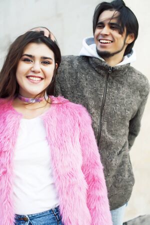 young happy students teenagers at university building on stairs, lifestyle people concept boy and girl