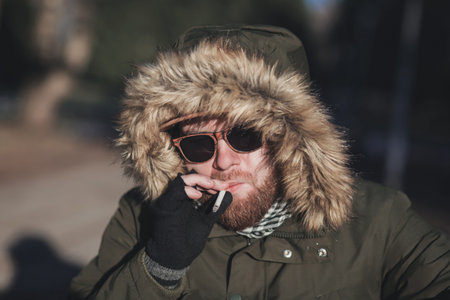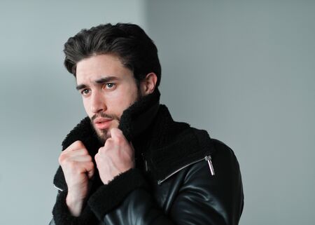 A large portrait of a stylish young man with a beard and dark hair in a black leather jacket with faux fur collar.