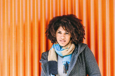 Gorgeous African American style woman with gray coat in front of an orange wall