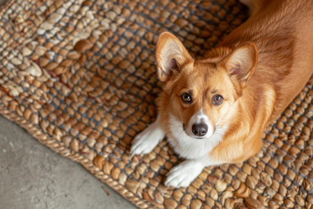 Top view of a cute corgi dog with bright eyes, resting on a textured mat