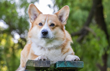 The worlds smallest shepherd dog. Portrait of Pembroke Welsh corgi close up on green blurred background. Desktop screensaver with a cute dog.
